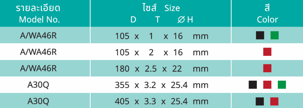 Cutting Wheels เป็นแผ่นตัดชนิดเรซินที่ออกแบบมาสำหรับการตัดโลหะและวัสดุอุตสาหกรรมต่าง ๆ ให้การตัดที่รวดเร็ว คม และแม่นยำ เหมาะสำหรับใช้งานกับเครื่องเจียรไฟฟ้า (Angle Grinder) ในงานอุตสาหกรรม งานช่าง และงานซ่อมบำรุงทั่วไปใบตัดผลิตจากเม็ดสารเจียรคุณภาพสูง ผสมกับเรซินชนิดพิเศษ ทำให้มีความแข็งแรง ทนต่อแรงหมุนและความร้อนขณะตัด ช่วยเพิ่มประสิทธิภาพในการทำงานและยืดอายุการใช้งาน